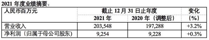 2021年,公司克服大宗商品涨价等不利影响,毛利率水平稳中有升,周转效率高位运行,彰显强劲经营韧性。报告期内,实现营业收入2035.5亿元人民币,同比增长3.2%。归属于上市公司股东的净利润92.5亿元人民币,同比增长0.3%。基本每股收益为1.1元人民币。公司高度重视股东回报,全年共派发股息每10股3.7元。