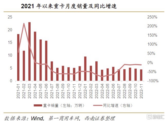 回到重卡行业周期来看,市场普遍认为2023年重卡行业将迎来复苏。西南证券指出,自去年5月以来,重卡市场已遭遇“19连降”,重卡销量跌至冰点。但8月以来同比降幅已经缩窄至10%左右,呈现一定销售回暖现象。最新11月数据显示销量4.5万台,同比降幅约12%,主要是受到广州、重庆等地疫情影响。
