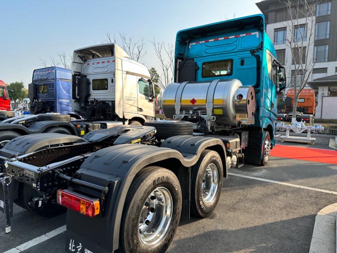 燃气重卡方面,北京追梦LNG普货运输牵引车,搭载的是X15N-530马力康明斯发动机,同时可以选择500马力,匹配采埃孚12挡AMT手自一体变速箱。整车自重轻至8.5T,数智节气更高效,且长、短途差异化标定,自动挡标定程序快速迭代,在保证操控性能持续提升情况下气耗优于手动挡,百公里综合气耗较同类车型低1-2kg。