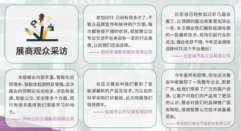 每年都参加这个展会,在各种细节方面,都明显地感觉到主办方的用心。展会期间了解到了公交客车行业的最新发展动向,同时也对例如氢燃料、轻量化、智能化等做了信息的收集,更为重要的是对以后客车业的发展有了更加清晰的判断。 ——上海燃料电池汽车商业化促进中心