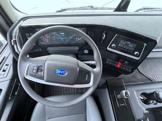 进入驾驶室,可以看到比亚迪Q3纯电动牵引车的驾驶室采用了环绕式仪表台,多功能方向盘抓握感非常贴合手掌,仪表盘采用了机械指针加8寸液晶显示屏的设计,显示信息简洁明了,能让驾驶员及时掌握车辆动态信息。而且,中控台功能按键触手可及,充分诠释了“以驾驶者为中心”。另外,这款车还能选装PAD系统,10.1英寸的高清大屏等多种功能。