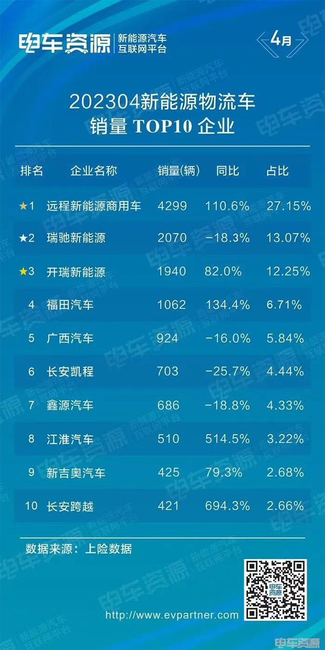 同比增长82%! 奇瑞旗下开瑞汽车4月新能源物流车销量TOP3