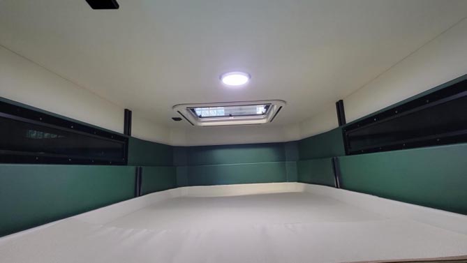 在不升顶的情况下,下方的一张纵置床也可以满足单人的睡眠,通过座椅的前移可延展达到1850mm*850mm;床尾上方安装了KME的房车变频空调,床下位置装有房车专用冰箱,床板下多余的空间就是整车的一个独立储物区域。