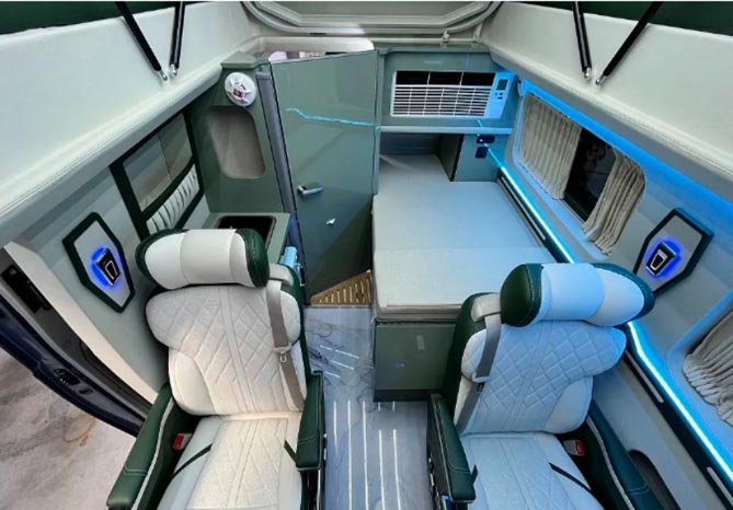 这款由依维柯聚星底盘打造的齐星星领多功能旅居房车的车身内部,可布局4座商务座椅组合或6人对卡座版,空间利用率高,坐乘舒适安全;采用齐星最新发布的四柱电动硬升顶结构,在保温隔热与便利性同时完善了整车的防水性,只需通过一键升顶,内高可以达到2米,方便驻车状态的起居活动空间;内外双升顶的组合,让二层升顶可以形成一张1950mm*1150mm双人床,硬升顶的连接结构,贴心安装了侧面采光窗与顶部的房车天窗,一觉睡到自然醒。