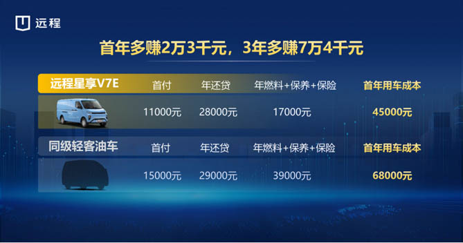 远程还替用户算了一笔“经济账”,V7E买车首付11000元,年还贷28000 元,年燃料+保养+保险17000元,年用车成本共计45000元;而同级轻客油车买车首付15000元,年还贷29000元,年燃料+保养+保险39000元,年用车成本共计68000元!同样的货源,同样的付出,用V7E首年多赚23000元,前3年多赚74000元!对同级燃油市场形成强大冲击。