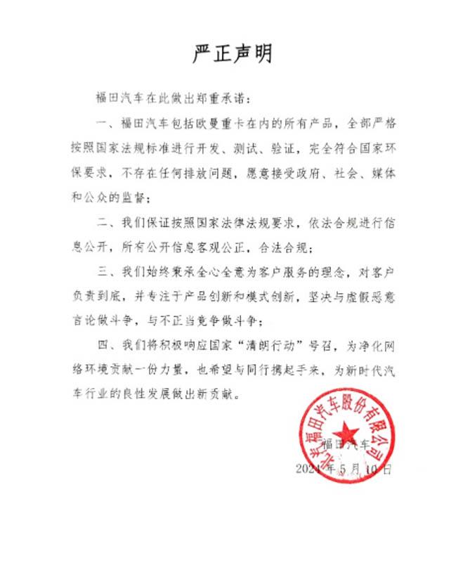 在说明会现场,刘旭光代表福田汽车向媒体和公众发布了严正声明:福田汽车所有产品完全符合国家环保要求,不存在任何排放问题;福田汽车按照国家法律法规要求,依法合规进行信息公开,并做到所有公开信息客观公正,合法合规;福田汽车将对客户负责到底,坚决与虚假言论和不正当竞争作斗争;福田汽车将积极响应国家“清朗行动”号召,为新时代汽车行业的良性发展做出新贡献。
