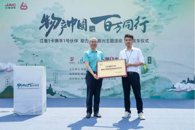 作为江汽集团的核心战略业务之一,江淮1卡积极履行社会责任,在抗震救灾、乡村振兴中贡献力量,在全国各地携手新华社共建“江淮1卡村”,为我国的经济建设和社会发展发挥了重要作用。“物产中国 百万同行”活动旨在联合各地文旅部门、新闻媒体、电商平台、地方企业、高里程用户等多方力量,探索全国各省市区的地理标志保护产品,助力做大做强当地优势特色产业,助推乡村振兴跑出“加速度”。