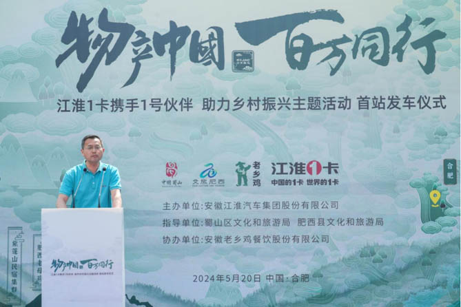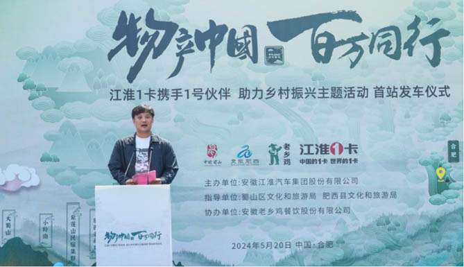2024年5月20日,江汽集团迎来建厂60周年纪念日。甲子JAC,1卡献礼!江淮1卡“物产中国 百万同行”活动安徽站首站发车仪式在安徽省合肥市老乡鸡中央厨房举行。活动现场,安徽省合肥市蜀山区文化和旅游局、安徽省合肥市肥西县文化和旅游局、安徽著名餐饮品牌老乡鸡、江淮1卡,以及来自全国各地的江淮1卡荣耀1号伙伴、媒体朋友们齐聚一堂,共同讲述“国家地理标志保护产品——老乡鸡”的故事,助力乡村振兴。
