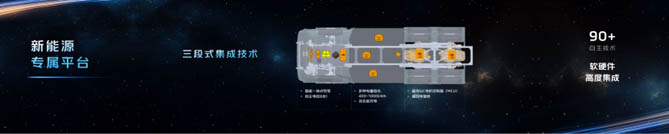 欧曼银河9是油气氢电混多技术路线,其专属的新能源平台,采用创新的三段式集成技术,拥有超过90项自主技术,实现高效轻量化电驱桥、全域高效碳化硅控制模块、多种电量组合和兆瓦级充电技术、智能一体化热泵技术、自主8合1电控技术等软硬件高度集成。针对燃油/气车平台,欧曼银河9也实现了全面的迭代进化,匹配了最新升级的第五代超级动力链,首次采用VCU实现对发动机和变速箱的中央管理,油/气耗比现有平台降低5%;同时采用全新电气架构,率先在商用车行业里应用百兆以太网,传输速率是现有平台的200倍,可充分满足自动驾驶和智能座舱大数据传输需求。