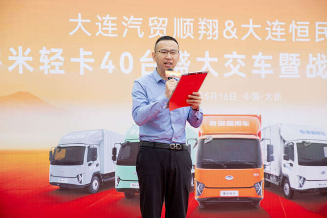 5月16日,一场盛大的交车仪式隆重落幕——大连汽贸顺翔&大连恒民生鲜40台零米轻卡盛大交车暨战略签约仪式。奇瑞商用车零米轻卡营销公司副总经林涛、宁德时代业务总监魏瑞鹤、大连恒民生鲜副总经理周健城、大连汽贸顺翔总经理程洪彪 (零米轻卡经销商)等代表参加交车仪式。