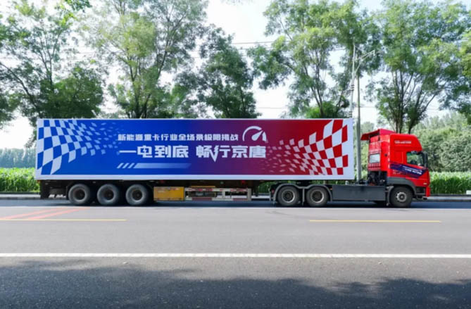 从装车到运送再到厂区卸货,再返回到河北唐山,车辆在实况运输场景下满载49吨,全程历时9小时,凭借一次充电、一电到底的实力,最终以每公里1.06度电耗,成功挑战332公里续航量程,给新能源重卡跨市、跨省运营提供了真实示范。