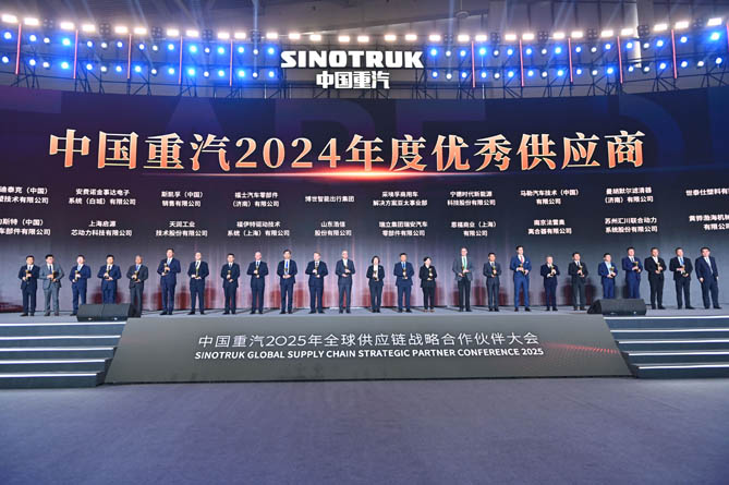 同时,中国重汽表明2025年的合作态度和行动策略。其中包括,始终坚持开放包容、深度融合、更好发挥资源优势,带动战略合作向纵深、卓越、全面发展;坚持与最优秀、最忠诚、最知名的供应商伙伴深化合作,建立“你中有我 我中有你”的战略、价值、命运共同体;坚持联合创新,赋能产业链变革,更好发挥研发共同体的作用,在科技创新、产品研发、应用工程等方面,构建全流程、深层次、多潍度的合作体系,真正实现战略联动、项目联动、资源联动,提升供应链原始创新能力,打赢新能源、数智化、后市场三大攻坚战,构建未来发展的领先优势和强大动能;坚持联动出海,加速产业链走向市场,将在全供应链推进更严格的质量标准、更科学的价值降本、更正向的采购规划,加快构建全球市场竞争优势;坚持联同融合,推动产业链安全高效,聚焦供应链安全可控,高效运行,携手积极拥抱数智供应链,加快信息共享、智能连接、供需匹配、灵活精准、业务协同、高效畅通的智慧供应链网络。