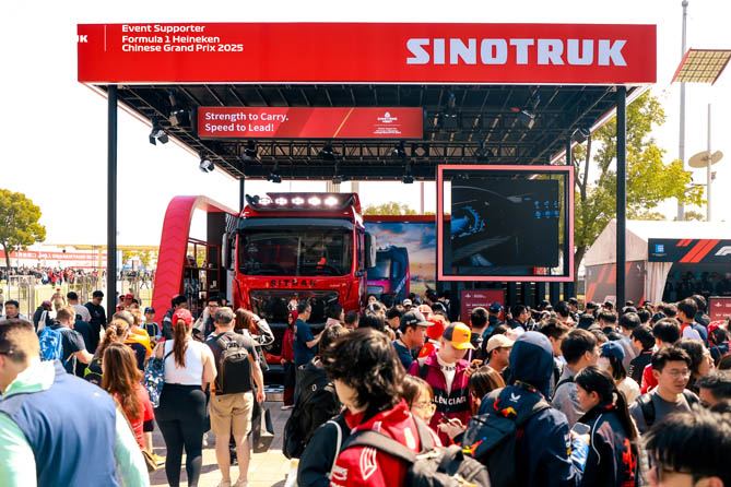 中国重汽展位,位于F1中国大奖赛商贸区核心区,诠释着工业科技感与力量感,更体现出重卡的实用与美学的完美结合。