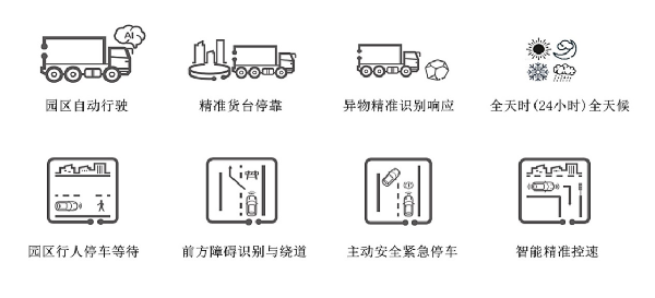 为解决园区内库房与车间、车间与车间的短驳定点人工搬运的问题,园区采用智能驾驶技术,降低人工成本、后勤成本;以最优驾驶系统策略,通过精准操作减少能耗以及车辆维护成本。同时,从园区安全和减少货物损坏的角度出发,智能驾驶车辆在全流程短驳运输,如出入自动泊车、自动对接充电、货台精准接驳、常行驶与跟车、避障通过等场景 ,行驶平顺、稳定,避免了颠簸以及急刹急停的发生。为了避免行驶中的盲区节点,在多重冗余的感知方案中除了前向、后向的监测感知,还包括了覆盖车身周边盲区的环视摄像机组、自动检测车身下方区域的底盘透视摄像机组、车身周边的超声波雷达、侧视激光雷达、侧视摄像机,为车辆提供360度环绕视野,能对10厘米以上的异型障碍物进行响应,提升稳定性及安全性。