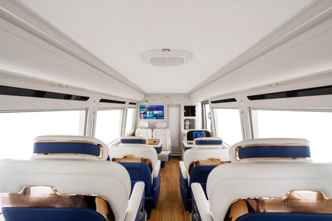 于乘坐中享受智美,作为新时代高端公商务客车,宇通T7星辰版满载数字化智享装备,拥有5D光影皮革、电控推拉门以及原厂定制高级航空座椅、32寸高清投屏电视、车载WiFi、220V电源、HDMI/USB插口等便捷配置一应俱全。此外全车配备NVH超级静音技术,完美隔绝外部噪音,让每一次出行都静享私密,随心到达。