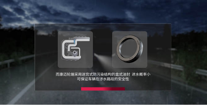 使用油润滑技术的康迈轮端,采用的是盒式油封,与传统油封相比,拥有复杂的迷宫式防尘设计和更强壮的骨架,并有专门的防泥水设计辅助,进水概率小,可保证车辆在涉水路段的行驶安全性,帮卡友省力、省时、多赚。