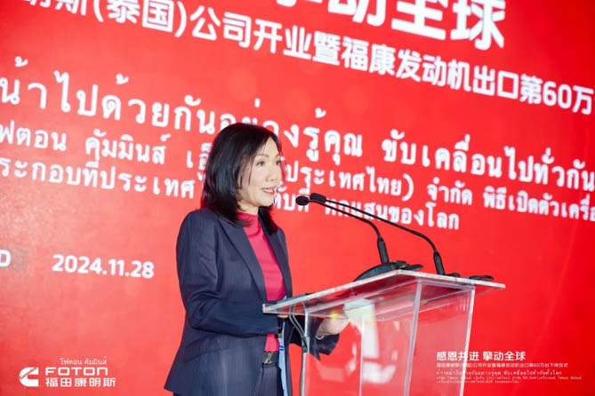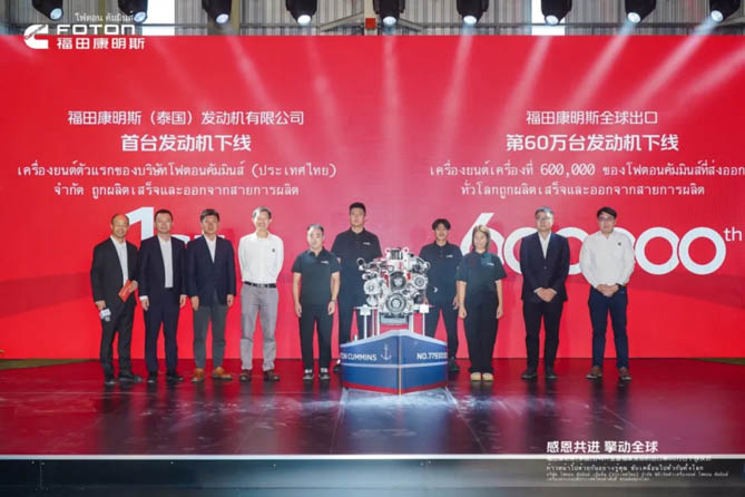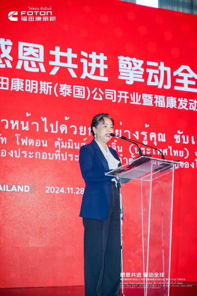 开业典礼上,福田康明斯总经理陈剑表示:“依托双方领先的整车及发动机技术研发、全面布局的销售、服务网络以及北京福田康明斯全球“灯塔工厂”的智造技术,福田康明斯已经为全球100多个国家和地区提供了多元动力解决方案,从裸机出口到助力整车出口,从欧洲、北美到全球市场,从聚焦商用车拓展到非道路应用,福田康明斯持续助力全球用户取得成功。福康泰国公司将共享北京福田康明斯先进的研发技术、共享全球供应链,坚守“零缺陷”质量原则,为全球用户提供高质量的发动机产品和智慧服务。”