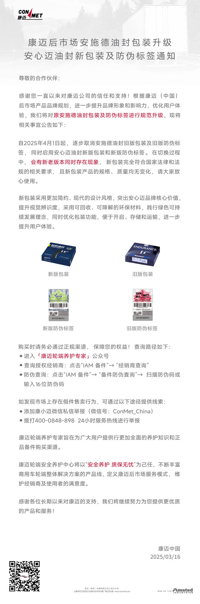 作为安心迈品牌升级的重要举措,康迈后市场启动安施德油封包装焕新计划:自2025年4月1日起,现有产品将逐步切换为安心迈油封新包装,并搭载全新防伪标签。