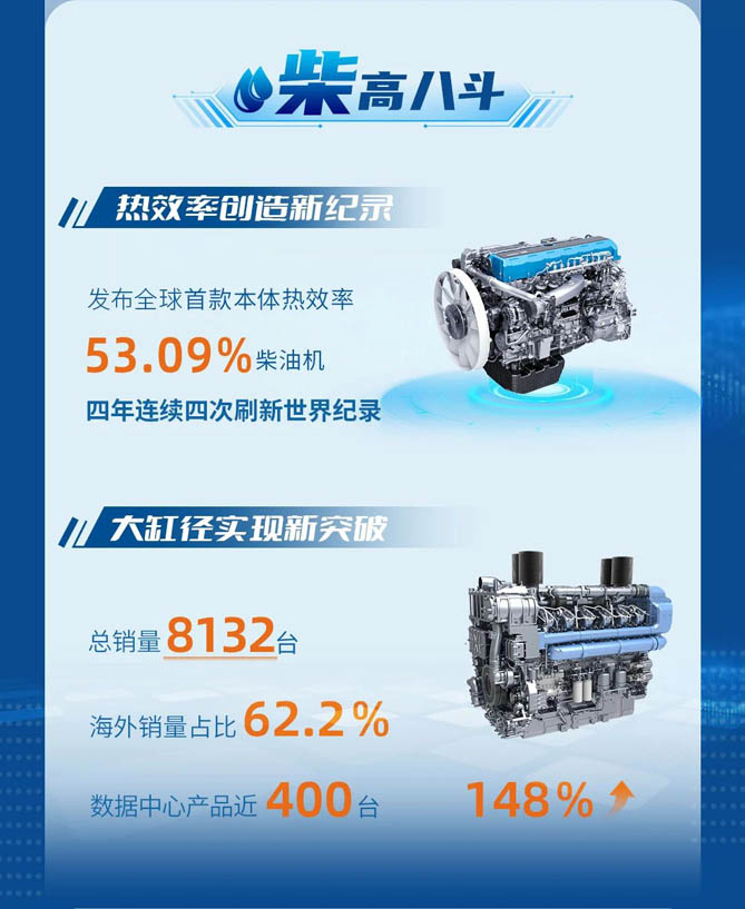内燃机低碳性能提升是传统动力升级的重点。高热效率柴油机可提升经济性和节能减排能力,公司不断在该领域开展技术攻关,2024年发布全球首款本体热效率53.09%柴油机,并四年连续四次刷新世界热效率纪录。此外,公司也通过大缸径发动机实现高端化升级。2024年,其大缸径发动机总销量为8132台,海外销量占比62.2%。其中数据中心产品近400台,同比增长148%。