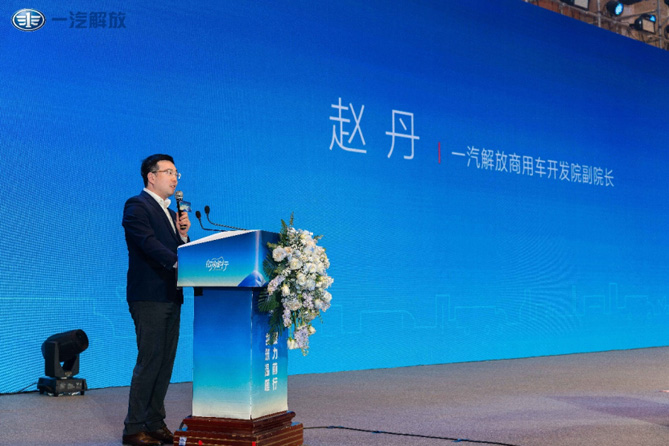 (一汽解放商用车开发院副院长赵丹先生发布“体系节油技术2.0”照片)