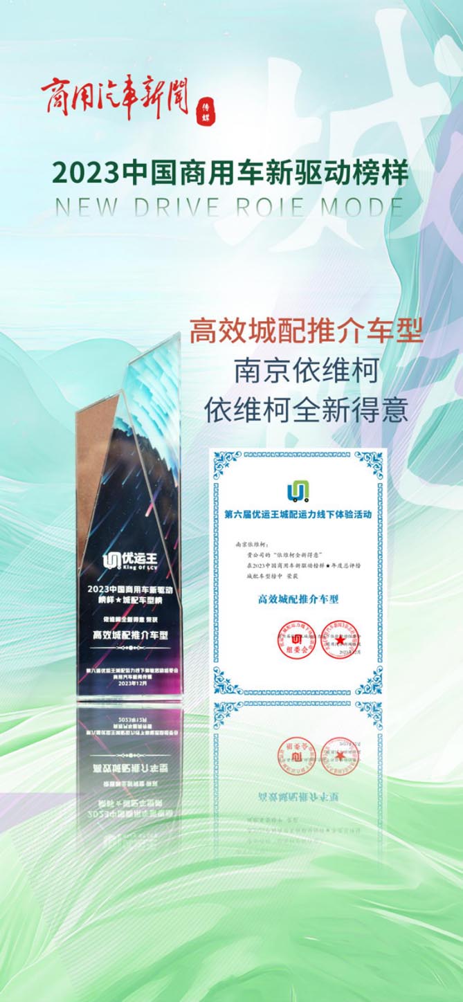12月21日,由商用汽车新闻传媒主办的2023第六届优运王城配运力大赛颁奖典礼在北京圆满举办。作为一场聚焦城配物流的专业性赛事,优运王城配运力大赛自举办以来,就以遴选优秀城配车型为己任。全新得意,作为南京依维柯的全新产品,在本届大赛中经过装箱比赛、场地操控试驾比赛和场外实际路况测试等多轮角逐,凭借硬核的产品实力脱颖而出,成功斩获了轻客组“高效城配推介车型”大奖,实至名归。
