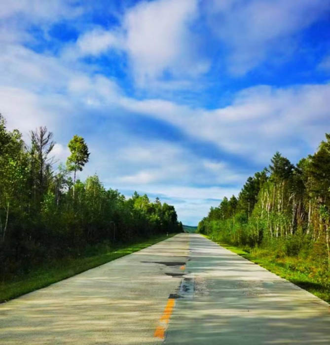 在一个雾天,孙女士开着房车,行驶在331国道上。开着开着,道路两旁忽然开始“长出”一棵棵高大的白桦树,薄雾轻饶,树梢在雾气中若隐若现,仿佛一幅幅流动的水墨画。阳光透过雾气,挥洒在白桦林间,形成了一道道光束。