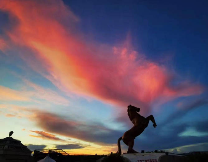 傍晚,孙女士抵达中俄边境的室韦小镇。在落日余晖的照耀下,蒙古马雕塑金光闪闪着,仿佛被赋予了生命,熠熠生辉,画面如同油画一般,“不在现场的话根本感受不到那种震撼美!”孙女士感叹道。
