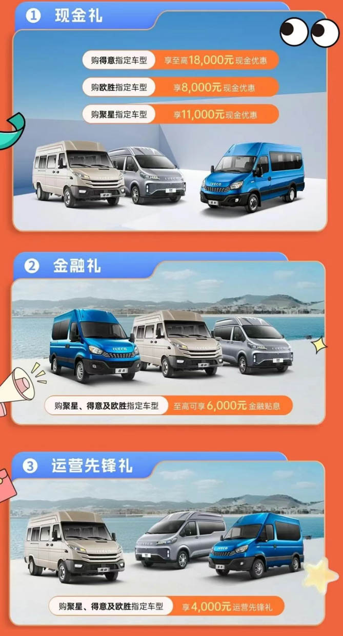赶快行动起来享受专属优惠吧!让您的每一次出行都成为一次难忘的旅程。把握机会,让依维柯成为您夏日出行的最佳伙伴。让我们共同迎接这个夏日的狂欢,开启您的依维柯之旅!