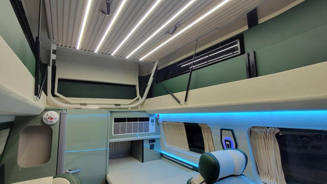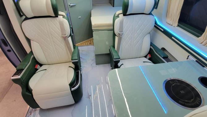 来到车身内部,一下就被它的温馨和舒适所打动。可布局4座商务座椅组合或6人对卡座版,空间利用率高,坐乘舒适安全;四柱电动硬升顶结构,在保温隔热与便利性同时完善了整车的防水性,只需通过一键升顶,内高可以达到1930mm,方便驻车状态的起居活动空间。