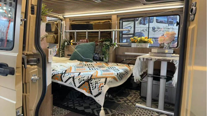 如果说欧霸·山海是纵横极端地形的铁甲武士,那么得意宿营车就是车轮上的“移动LOFT”。这款集短途住宿、DIY创造、应急救援、旅游租赁等多功能于一身的宿营车,以别致造型和田园风的温馨内饰成为露营爱好者的热门打卡地。