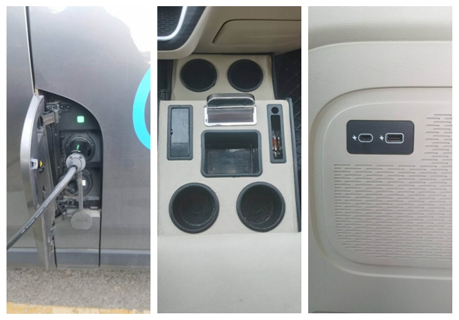 (充电口在车辆左边/前排中间有摆放水杯、手机等小物件的地方/电子设备接口两边都有)