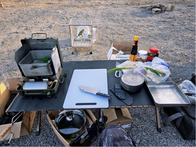 傍晚想休憩会,便找了块空地露营。把折叠桌椅支起来,从后备箱搬出卡式炉和锅碗瓢盆,直接在路边煮起了中午买的酸汤粉,香味飘出去老远。隔壁帐篷的大哥闻着味就过来了,看见我从后备箱搬出整套厨房用具,直感叹:“兄弟,依维柯是真能装啊!我们家后备箱塞得满满当当,啥都不敢多带,哪像你还能搞个移动厨房!”我笑着说:“我们家经常出去露营,有经验了,专门买的这种空间大能改装的车,出门在外图个方便省事!”