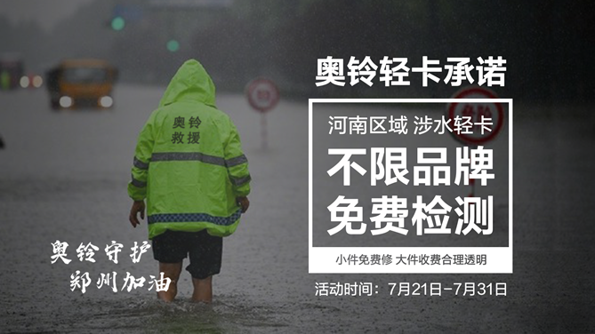 灾情发生以来,奥铃轻卡快速响应,第一时间研究对策支援前线。这次的降雨量,是所有人始料未及的,以至于很多卡友的车辆根本来不及转移,或者说压根无法转移。无数的车辆被洪水浸没甚至吞噬,当卡友们面对涉水车辆束手无策时,奥铃轻卡推出了河南用户专属服务政策。奥铃轻卡提出对河南涉水轻卡不限品牌免费救援、免费检测,小件免费修,大件收费合理透明的政策,最大程度降低卡友的损失。
