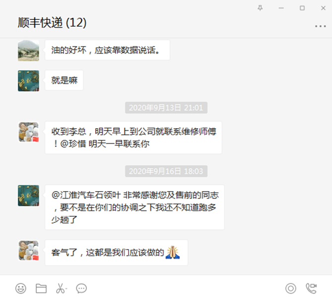 干一行爱一行,张师傅换新车让公司里其他师傅们高兴了好久,随着对张师傅的车逐渐了解,他们也都一辆接一辆买了江淮帅铃。在得知这些购买帅铃的师傅都来自顺丰快递公司后,邯郸地区的江淮轻卡经销商不定期地主动上门走访,为各位司机师傅的车辆进行免费的检查和保养服务,为了更高效地和顺丰快递的司机师傅们沟通,当地经销商还建起了VIP微信群,保证用户在任何时间有需求,帅铃都能第一时间快速反应。顺丰快递的师傅们说,有了新车和贴心的服务,今年备战双十一更有信心了。