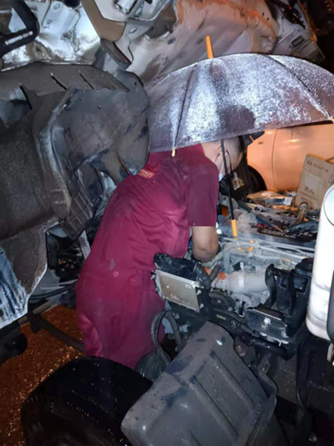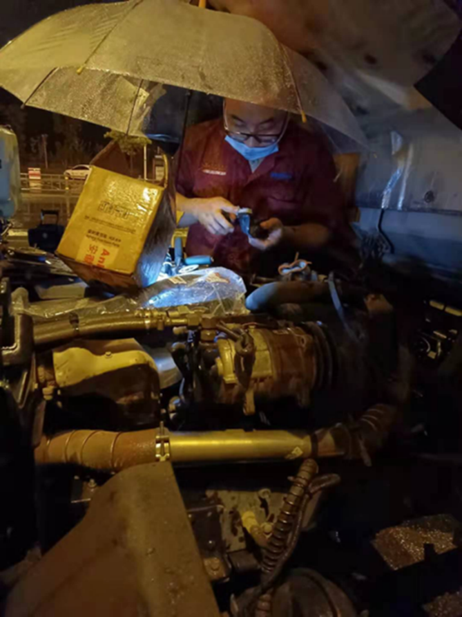 找到了故障原因,需要立即前往维修,考虑到谢师傅车上物资需要尽快送到,服务站准备好相关工具和备件后立即出发。一个多小时后,维修人员到达谢师傅车辆所在处,此时天空中还在下着大雨,无暇多想,维修人员简单撑上一把伞便开始着手修车。这场雨丝毫没有停下的迹象,小小的一把伞又怎么能挡得住大雨的冲击?不一会儿,维修人员的衣服已经湿透,但维修还在继续。