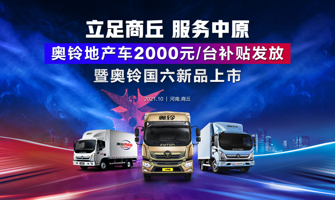 2021年10月13日,“立足商丘 服务中原 奥铃地产车2000元/台专项补贴发放暨奥铃国六新品上市”活动在河南商丘圆满举办。商丘市开发区招商服务局副局长王滨豪、河南福田智蓝新能源工厂厂长卢红春、福田汽车奥铃营销公司总经理杨雪峰、奥铃销售管理与行销副总经理巩大力、奥铃品牌副总经理张春来、奥铃市场与商品规划总监张斌、奥铃速运销售总监王竹青等领导,以及奥铃轻卡经销商、合作伙伴、媒体人士等百余人共聚一堂。