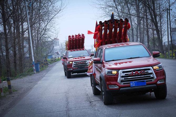 因此,卞队长产生了统一车队车辆的想法,想象一下,清一色红色礼炮车队,浩浩荡荡,数炮齐发,彩纸飞扬,那场面一定很精彩、很壮观,客户也肯定更满意。于是,卞队长首先找到他的亲戚、朋友说出自己的想法,并带头用T6置换了一辆红色的江淮T8皮卡,其他六人也积极响应,每人都买了一辆红色T8皮卡,组成了一个六人车队,命名为:“红色江淮风光车队”,只要谁家有大事、喜事约请,车队就统一行动,在城乡马路上形成一条靓丽的皮卡风景线,让红色江淮的喜庆和隆隆的电子炮声为东家增光添喜!