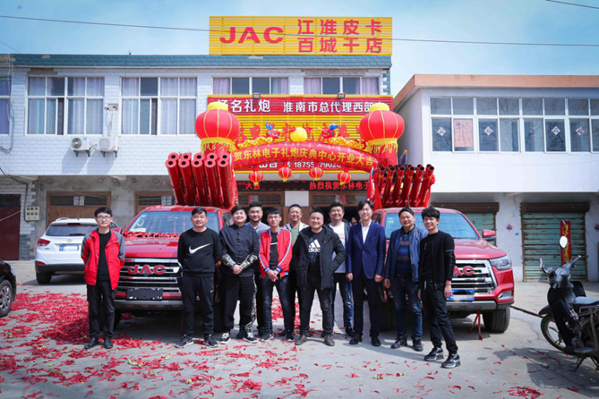 在安徽省淮南市有这样一支专业的江淮皮卡电子礼炮车队,队长姓卞,队员共有9人,平均年龄在40岁左右,他们主要为当地市民提供婚庆、奠基、开业、升学等庆祝活动服务。这个电子礼炮车队在当地是非常火爆,因为从2016年开始,淮南市开展了禁止燃放烟花爆竹的行动,当地单位或家里有红白喜事时,放鞭炮又是不可或缺的传统,于是无烟火的电子炮便成为了更加环保的替代品,这样一个电子礼炮车队便开始火爆起来。