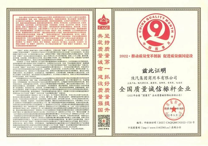 近日,在中国质量检验协会组织开展的2022年全国“质量月”活动及系列评选中,陕汽商用车凭借牵引车、载货车、自卸车、专用车等系列产品的质量和品牌优势,再次获得协会以及权威专家的一致认可,顺利荣膺“全国质量诚信标杆企业”称号。这是陕汽商用车连续三年荣获该项殊荣,充分展现了陕汽商用车的质量管控实力。