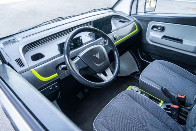 整体上看,大力牛魔王D05设计语言前卫大胆,走炫酷个性的机甲风。前脸线条十分硬朗,曲面简约时尚再加上车头不走寻常路的矩形车灯,一眼望去,强烈的“科技未来风”扑面而来。这样的设计可不仅仅只是好看,更重要的是好用!以往的微卡车型,受制于前挡风玻璃,视野都不太好,而大力牛魔王D05这个前脸摒弃多余线条,风挡玻璃面积做到最大,给驾驶员更宽广的视野,更能保证安全。这种硬朗的线条设计还能给予驾驶室更大的腾挪空间,驾驶体验直接拉满。