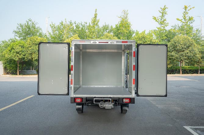 大力牛魔王D05公告中有厢式和栏板车型,其中厢式车身有两个尺寸为4500*1690*2145/2345mm,货厢容积达到6-7方。还有一个令人惊喜的设计细节是,货厢采用侧面双开和单开两种开门方式,其中后尾门采用全开式设计,装卸货物更轻松方便,省时省力。