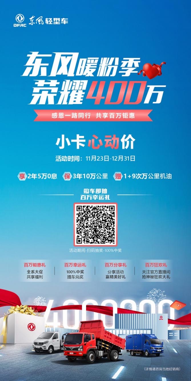随着东风汽车股份第400万辆车即将下线、智能制造和绿色工厂新总装落成,东风轻型车推出“东风暖粉季 荣耀四百万”一系列暖粉活动,东风小卡更是钜惠放价,给寒冬带来了一股“暖风”。