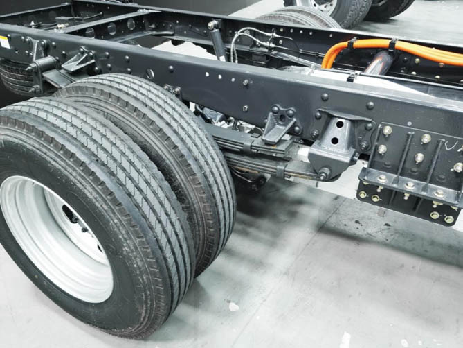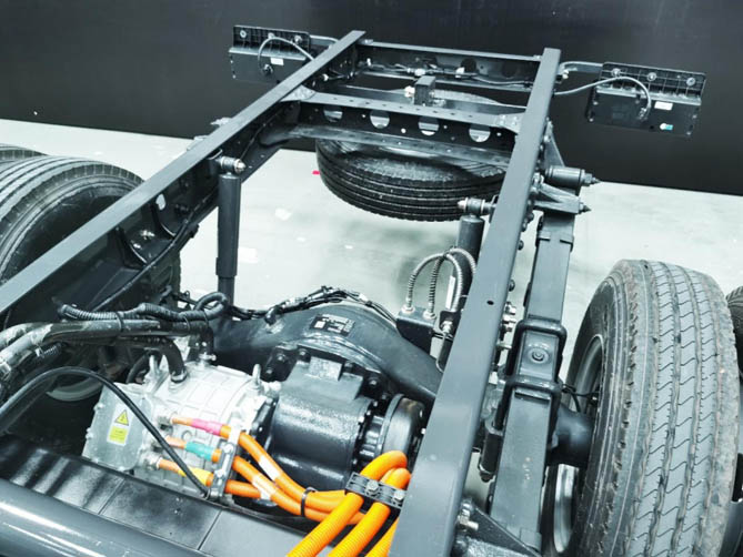 底盘采用直通梁,前后桥轮距及车架加宽,增加重货行驶稳定性。搭配前2.2T后5T级大载重电驱桥、前3后6+7的多片簧、190mm车架截面厚度,承载能力拉满,远超常规轻卡平均水准。