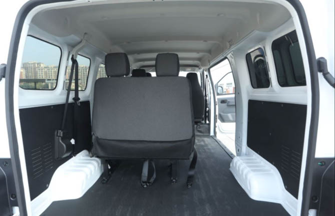 得益于宽体设计,江豚明窗车型的驾驶区域空间足够宽阔,中控台功能分区明确,并带有丰富储物空间,特别是空调杯架的设计非常暖心。江豚E5和E7的座椅分布可以根据实际应用进行相应布局,后排部分除了保证充裕的空间,所有座椅都配有头枕,保证乘座舒适性,并为安全提供必要保障。为了方便载货,座椅可进行折叠,或是采用悬挂方式收起。
