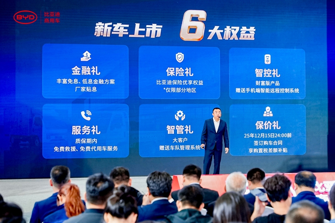 为赋能物流用户,比亚迪同步推出 6 大上市权益涵盖免息金融、保险优享、免费赠送智能远程控制系统、质保期免费救援和代用车服务、大客户专属车队管理系统及购置税报价补贴,覆盖购车到运营全周期,助力低成本高效创富。同时,三电系统10年/80万公里超长质保,为物流用户打造低成本高效创富方案,推动行业绿色智能升级。