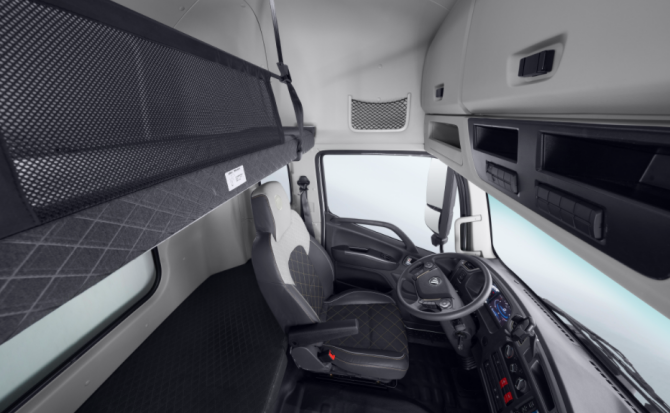 欧航R系列超卡不仅在动力和装载能力上表现卓越,更在驾乘舒适性和智能化水平上做到了全面升级,充分体现了对城际长途驾驶员的人文关怀。车辆采用了高顶双卧平地板驾驶室设计,内部空间宽敞通透,2.3米站立高度充足,为驾驶员在长途驾驶过程中提供了舒适的活动空间。驾驶室配备了多向调节的航空级气囊座椅,具备良好的包裹性和支撑性,能够有效过滤路面颠簸,减轻驾驶员的身体疲劳。1.2M超宽的上下卧铺设计,为驾驶员提供了良好的休息环境,确保其在城际长途运输中能够得到充分休息,以最佳状态投入工作。