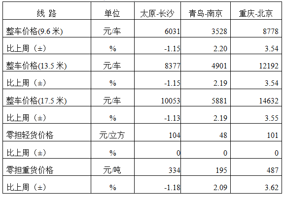 表1 本周部分线路平均价格及环比情况对比