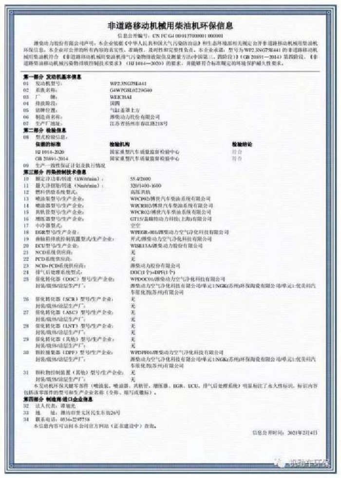 据机动车环保网信息,2月4日中国四阶段非道路移动机械用柴油机首张信息公开证书诞生。该证书花落潍柴。