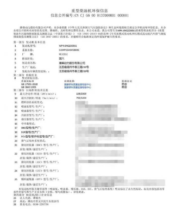 同样,记者翻阅潍柴官方微信《潍柴资讯》,看到:早在2018年10月9日,潍柴就以000001 编号,获得国家生态环境部的环保信息公开单,潍柴WP4.6N发动机率先通过重型柴油机国六b官方认证。