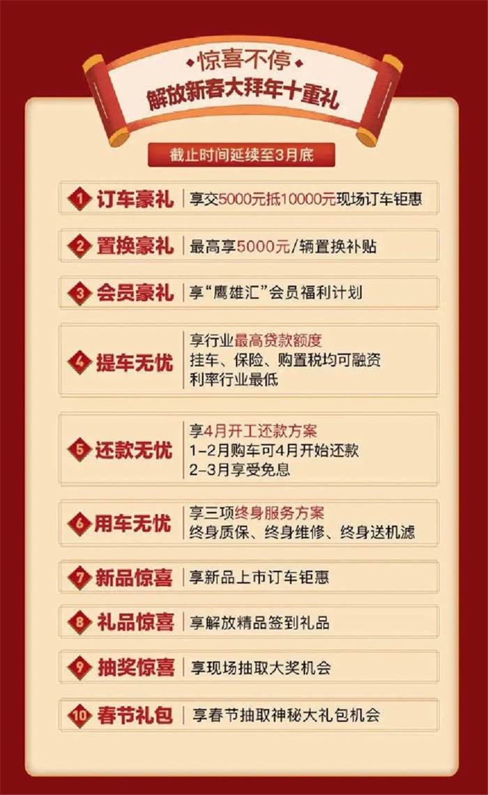 此外,一汽解放还制定多项金融优惠政策,推出“缓冲金融产品”让贷款缓一缓、“五最金融产品”成为卡友新春购车最强助攻。提供最佳服务解决方案, 1月1日起,解放“感动服务”领航计划正式启动,实现“终身质保”、“权益保障”、“过程体验”三个方面升级,为客户满意度提升奠定坚实的基础!